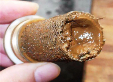 用活口扳子,可以打開這個接頭的頂端。把頂部取出來,就能看到連接著的濾網。用水沖洗濾網,就完成了地暖濾網的基本清洗。我們可以在每年供暖前半個月到一個月的時間里清洗濾網,觀察濾網的狀態。如果濾網上面只是有輕微泥沙,簡單清洗濾網后就可以了。如果濾網一斤被泥沙堵死了,比如下圖中這樣▼